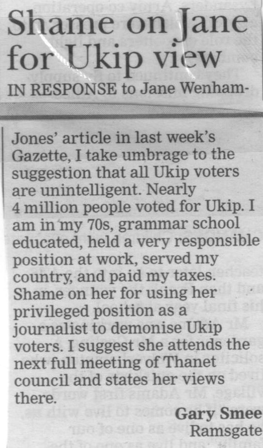 This was my Isle of Thanet Gazette column, published 8/05/2015 that gave rise to the following on this week’s letter page. As I said on twitter – thanks for all the amusing response! – I love the idea that I should pay for my sins by attending a council meeting…. Punishment indeed!!! 🙂