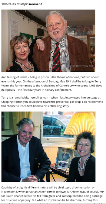 Being in prison is the theme of not one, but two of our events this year. On the afternoon of Sunday May 19th, I shall be talking to Terry Waite, the former envoy to the Archbishop of Canterbury who spent 1,763 days in captivity – the first four years in solitary confinement.